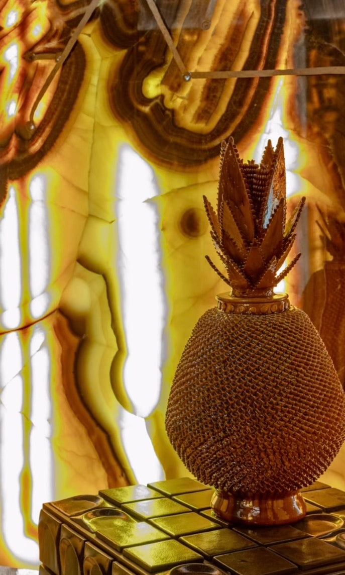 Desde San José de Gracia, en Michoacán, vienen estas imponentes piñas decorativas que son fabricadas por las familias en barro durante largas temporadas por su complejidad, paciencia y talento en la elaboración.
