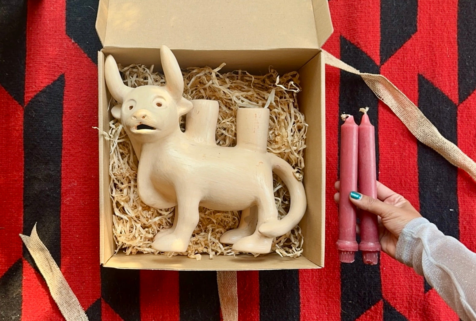 Vaca de barro quemado en tres diferentes colores (Terracota, crudo y gris) con 3 portavelas para decorar tus mesas, las barras y libreros.